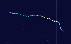 An area of disturbed weather was witnessed well south of mainland Mexico on August 18.[7] The system developed into a tropical storm on August 20. It slowly strengthened, moving generally west-northwest, and became a hurricane on August 22. It continued strengthening, and was briefly a Category 3 major hurricane on 24. Fernanda weakened after that, and it was a tropical storm by the time it crossed 140°W and entered the central Pacific.[4] It remained at a steady intensity until it rapidly weakened when north of Kauai on September 1. A flash flood on Waipio Stream in the Big Island's Kohala Mountains may have been due to Fernanda. Other than that, this tropical cyclone caused no known impact.[5]