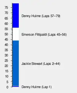 Hulme won in a time of 1hr 45.49.1mins., averaging a speed of 114.898 mph, and was over 14 seconds ahead of Fititpaldi. Revson was a further 12.7 seconds behind. Only other drivers to complete the full race distance were Mario Andretti (Ferrari) and Ronnie Peterson (March). This victory gave Hulme a six-point the lead in the World Championship.[2][4][5]