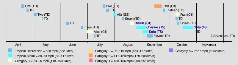 Two of the season's landfalling storms had severe impacts. In August, Hurricane Brenda struck the eastern coast of the Bay of Campeche, killing 10 people in Campeche, and causing the worst flooding there in decades. Then, early in September, Tropical Storm Delia hit the northwestern Gulf of Mexico coast, inundating parts of Texas and Louisiana with significant rainfall, which resulted in 5 fatalities and $6 million (1973 USD) in damage. The most intense cyclone of the season was Hurricane Ellen, which reached Category 3 strength during its trek over open water. Also, the season's final named storm, Tropical Storm Gilda, was meteorologically significant in that it became the first documented tropical cyclone on record to transition into a subtropical cyclone.
