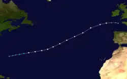 The strongest storm of the season, Hurricane Ellen, began as a tropical wave that moved off the western coast of Africa on September 13.[2] On the following day, the wave spawned an area of low pressure south of the Cape Verde Islands that quickly became a tropical depression. Tracking northeast, the system intensified into a tropical storm on September 15 after sustained winds of 45 mph (75 km/h) were reported by a French naval vessel; however, due to sparse data on the storm, the first advisory on Ellen was not issued for two more days. A slightly elongated storm, Ellen gradually intensified over the open Atlantic and was steered by two troughs of low pressure. On September 18, the storm took a nearly due west track and the system became increasingly organized, with an ill-defined eye becoming present on satellite imagery.[2]