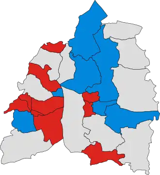 Map of the results of the election. Colours denote the party achieving the highest number of votes in each ward. |