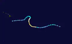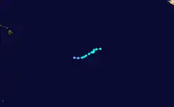 Intensification slowed on August 24 as Ione attained winds in excess of 100 mph (160 km/h). Over the next day, the system turned northward and attained its peak intensity late on August 25 with winds of 115 mph (185 km/h).[7] Additionally, the storm attained an estimated minimum central pressure of 954 mbar (hPa; 28.17 inHg).[1] Shortly after reaching this intensity, Ione weakened as it began a U-shaped curve, tracking northeast before turning towards the southwest. During the afternoon of August 27, the system was downgraded to a tropical storm. By August 29, Ione further weakened to a tropical depression and acquired a westward track before dissipating south of Hawaii on August 31.[7]