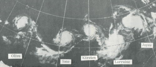 The overall activity of the 1974 season was near normal, with 25 tropical cyclones developing. Of these storms, 18 were named, 11 became hurricanes and 3 reached major hurricane status. Although the overall number of storms was normal, an exceptionally active period took place from August 19 through September 1. During this two-week span, six storms developed, five of which were active simultaneously on August 23: Ione, Joyce, Kirsten, Lorraine and Olive. Of the season's 447 bulletins, 139 were issued during this period.[1]