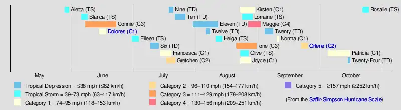 Connie | June 7 – 22 | Category 3 hurricane | 125 (205) | 942 | None | None | 0 | |||