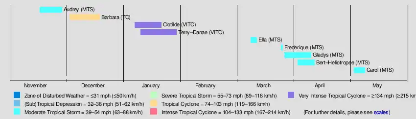 Moderate Tropical Storm Audrey developed on November 17. Audrey struck Madagascar shortly before dissipating on November 29.