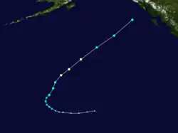 The remnants of Hurricane Ilsa interacted with a mid-level trough to produce a new low-level circulation on August 31, about 930 miles (1,500 km) northeast of Hawaii. The new system absorbed the remnants of Ilsa as it moved westward. Thunderstorms increased around the low, resembling a subtropical cyclone by September 1. Its track over warmer waters caused the storm to transition into a tropical storm on September 2, by which time the convection organized into rainbands. By that time, the storm was about 685 miles (1,102 km) north of the Hawaiian island of Kauai. The storm quickly developed a central dense overcast, and by 00:00 UTC on September 3 Dvorak classifications began on the cyclone. An approaching cold front turned the storm to the north and northeast. Around that time, the storm developed an eye in the center of the convection, suggesting that it intensified into a hurricane late on September 3, located about 1,170 miles (1,885 km) south of Alaska. It was a small system, measuring about 85 miles (140 km) in diameter.[12] A nearby ship reported sustained winds of 63 mph (102 km/h), while another nearby ship reported a pressure of 1003 mbar (29.6 inHg), with a 3-hour tendency increase of 13.5 mbar (0.40 inHg), suggesting a minimum pressure of under 990 mbar (29 inHg).[4][12][13] After maintaining hurricane status for about 18 hours, the storm weakened due to strong wind shear from the approaching cold front. Early on September 5, the cyclone became extratropical in the Gulf of Alaska, while located about 315 miles (510 km) southwest of Juneau, Alaska. On the same day, the circulation was rapidly absorbed by the frontal system,[13] and the remnants quickly reached the coast of British Columbia.[5][12] The remnants of the storm turned southeastward, and the low was last tracked definitively to a point north of Montana.[13]
