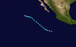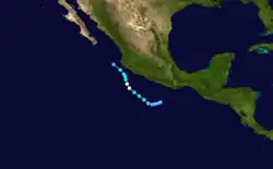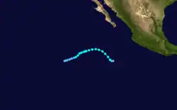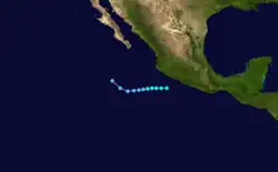 On August 24, a tropical depression formed from a tropical disturbance about 250 mi (400 km) south of Acapulco. It intensified into Tropical Storm Jewel the next day. The tropical cyclone headed generally northwest and paralleled the coast of Mexico.[4] On August 27, Jewel became a hurricane for mere six hours,[2] the minimum possible time in HURDAT.[11] Jewel then turned to the west, and then back to the northwest. Jewel weakened to depression strength on August 31. Tropical Depression Jewel dissipated shortly after that, although its remnants remained distinct until September 3. There was no impact.[4]