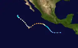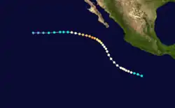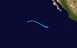 On August 29, an area of weather developed directly into a tropical storm, skipping the tropical depression stage.[2] Katrina steadily intensified as it headed west-northwest, gradually turning to the northwest. It peaked in intensity on September 3 as a Category 4 hurricane with winds of 130 mph (209 km/h), the second highest of the season.[2] Katrina then headed westward and rapidly weakened. It was downgraded into a tropical storm on September 5 and a depression on September 6. The last advisory was issued on September 7 when Katrina dissipated. Although the hurricane brought Category 3-equivalent winds to Socorro Island on September 2, no damage was reported there or anywhere else.[4]