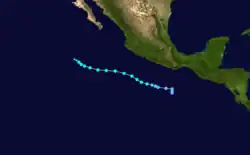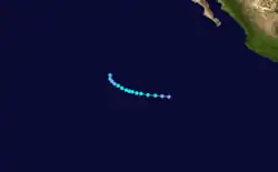 On August 18, a tropical depression formed south of the Gulf of Tehuantepec from a tropical wave that had entered the Pacific Ocean from the Atlantic Ocean. It strengthened into a tropical storm later that day. The tropical storm moved westward, and became a hurricane on August 21.[4] Ilsa became a Category 2 hurricane on August 22. It maintained that intensity for three days as it moved out to sea.[2] On August 25, Ilsa turned westward and rapidly weakened. It fell to tropical storm intensity on August 26. Later that day, while still maintaining winds of gale-force, Ilsa ceased being a tropical cyclone.[2] Ilsa's remnants continued out over the open Pacific Ocean.[4] The remains of Ilsa eventually interacted with another weather system. That triggered the development of the unnamed hurricane of August 31–September 5[5]