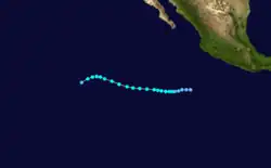 In the eastern Pacific (east of 140°W), sixteen tropical storms and eight hurricanes formed. Four of the hurricanes became major hurricanes by reaching Category 3 or higher on the Saffir-Simpson Hurricane Scale.[2] These numbers are close to the long-term averages of fifteen tropical storms, nine hurricanes, and four major hurricanes.[3] There were also four unnamed tropical depressions.[4] The only system to enter or form in the central Pacific (between 140°W and the international dateline) was an unusual high-latitude hurricane (north of 30°N), which went unnamed. This was the first occurrence on record of a mid-Pacific upper tropospheric low developing into a tropical cyclone, and the first hurricane on record within the central Pacific north of Hawaii.[5]