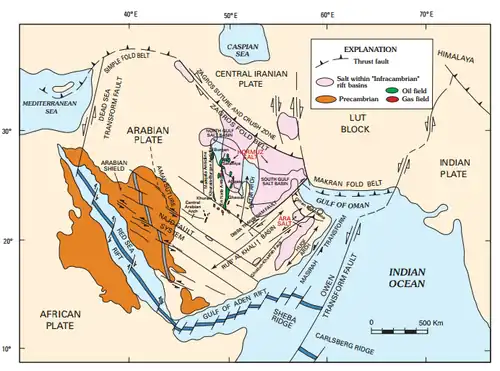The Iranian plateau is a broad zone of deformed continental crust as it is wedged between the Arabian and Eurasian plates. The Arabian plate, located southeast of the plateau, undergoes oblique convergence with the Eurasian plate in the northeast at a rate of 22 cm (8.7 in) annually. Deformation of the crust is distributed non-uniformly by the fold and thrust belts of the Zagros, Alborz, and Kopet Dag; oceanic lithosphere subduction along the Makran Trench; and strike-slip and reverse faulting within the plateau. The Iranian plateau itself is divided into rigid tectonic blocks. These crustal blocks are aseismic, but at their boundaries, seismicity is high.[3]