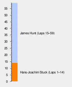 Immediately, Scheckter began to take advantage of the others' uncertainty in the conditions and, by lap five had moved from ninth to fourth. Stuck was also going well in the wet, and, despite losing his clutch cable in the first few laps, pulled away from Hunt. Lauda passed his teammate Reutemann for fifth spot when the Argentine spun. On lap 15, with Hunt four seconds behind, Stuck, struggling to make gear changes without a clutch, popped out of gear entering a corner and went straight on. He retired with damage to the monocoque.