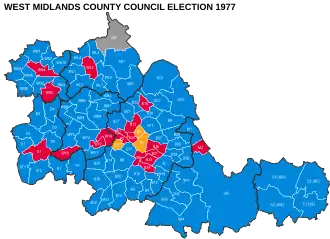 ![]() Map showing the results of the 1981 West Midlands County Council election by electoral division. | |||||||||||||||||||||||||||||