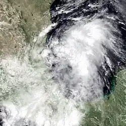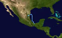 A tropical disturbance formed over the Isthmus of Tehuantepec on August 24.[29] By the following day, the disturbance developed into a tropical depression,[3] operationally classified as the eight of the season. The depression entered the Bay of Campeche on August 25 and headed northward.[29] Around 06:00 UTC the following day, the system peaked with maximum sustained winds of 35 mph (55 km/h).[3] However, on August 28, a ridge of high pressure forced the system to move west-southwestward,[29] causing it make landfall in a rural area of Tamaulipas later that day.[3] The depression brought heavy rainfall to some areas of Mexico, with 18.94 in (481 mm) of precipitation observed in Santa María Xadani, Oaxaca. Rainfall extended northward into Texas, peaking at 4.86 in (123 mm) in McAllen.[29]