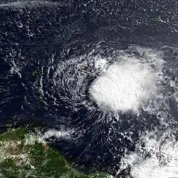 Tropical Depression Fourteen formed on October 12 near Honduras and slowly moved to the northeast towards Cuba. The depression remained south of Cuba and turned back towards the Yucatan Peninsula. The depression made landfall in the Yucatán Peninsula on October 20 and dissipated shortly thereafter. Impact from the depression in this region is unknown. Toward the end of October, a tropical depression formed in the eastern tropical Atlantic on October 22. It moved northwest over the next six days, dissipating on October 28 to the southwest of the Azores. The last tropical depression in October developed near Panama on October 24. The depression initially moved northward toward Cuba, but eventually veered southwestward. By October 29, the depression made landfall in Nicaragua and dissipated several hours later. Impact from this system in Central America is unknown.[39] A subtropical depression formed from an old weather front, or baroclinic zone, on November 6 near Puerto Rico. The depression moved northeastward but appeared to have made contact with the westerlies, as it turned off to the east-northeast. Ships that passed through the system recorded winds of 35-40 mph (55–65 km/h). Early on November 10, the system degenerated to a low pressure area, which soon dissipated.[7][39] The final tropical depression of the season formed northeast of the Greater Antilles along a frontal zone on November 13. The depression completed a quick recurvature over the next couple days without significant changes in intensity. By November 15, the depression dissipated as a tropical cyclone.[7]