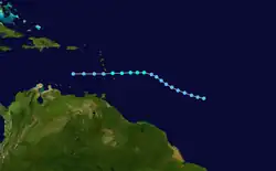 A tropical wave exited the west coast of Africa and entered the Atlantic on June 14. It headed westward and after satellite imagery indicated a closed circulation, the wave was classified as a tropical depression on June 19, while located several hundred miles east-southeast of the Windward Islands. The system was the first tropical cyclone to develop east of the Lesser Antilles in June since the 1933 Trinidad hurricane.[16]