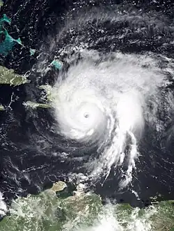 In Dominica, strong winds damaged or destroyed 80% of homes, leaving 75% of the island's population homeless. Agricultural was also severely impacted, with 75% of crops ruined, including a complete loss of bananas.[24] There were 56 deaths and 180 injuries.[7][24] Similar destruction occurred on Guadeloupe and Martinique, with hundreds left homeless and extensive damage to crops. Guadeloupe and Martinique also had $50 million and $100 million in damage, respectively. In Puerto Rico, flooding and high winds combined resulted in $70 million in damage and seven fatalities, four from electrocution.[24] Dominican Republic was lashed with very strong winds and torrential rains.[7][24] Entire villages were destroyed and numerous others were left isolated because of damage or destruction to many roads.[25] Thousands of houses were destroyed, leaving over 200,000 homeless in the aftermath of the hurricane.[7] Additionally, nearly 70% of the country's crops were ruined.[25] Overall, the storm caused at least 2,000 deaths and about $1 billion in damage in Dominican Republic. Minimal impact occurred in the Bahamas, Cuba, and Haiti.[7] In Florida, strong winds left moderate damage, including a downed radio tower, snapping a crane, and deroofing buildings.[26] There were also 10 tornadoes.[27] Damage totaled approximately $95 million.[26] Other states along the East Coast of the United States experienced flooding and tornadoes. The latter was particularly severe in Virginia, with tornadoes causing one death, damaging 270 homes, and destroying three other homes.[28] Throughout the United States, there were 15 deaths and about $320 million in damage.[7]