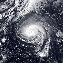Gloria briefly weakened to a tropical storm late on September 10, but re-strengthened into a hurricane on the following day. Eventually, the hurricane turned northeastward and began to accelerate. At 1800 UTC on September 12, Gloria attained its peak intensity with winds of 100 mph (155 km/h) and a minimum barometric pressure of 975 mbar (28.8 inHg). The storm then began weakening and fell to Category 1 hurricane intensity on September 13.[3] During that time, Gloria slowly began merging with a low pressure area that was located north of the Azores and lost tropical characteristics by September 15. Gloria was centered well north of Flores Island in the Azores, at the time.[7]