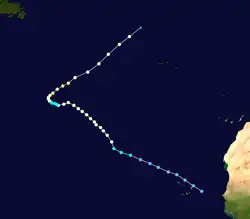 A tropical wave developed into a tropical depression at 12:00 UTC on August 25, while located about 870 mi (1,400 km) southeast of Cape Verde.[7] Moving westward, the depression intensified into Tropical Storm David early the next day. Shortly after attaining hurricane status on August 27, David rapidly deepened. By 12:00 UTC the following day, it was a strong Category 4 hurricane. Thereafter, the storm oscillated in intensity while approaching the Lesser Antilles and struck Dominica late on August 29 with winds 145 mph (230 km/h). After entering the Caribbean Sea, further deepening occurred and at 18:00 UTC on August 30, David peaked with maximum sustained winds of 175 mph (280 km/h). Late on August 31, it curved northwestward and struck Santo Domingo, Dominican Republic at the same intensity.[3]