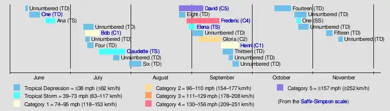 Tropical cyclogenesis began in June, with three tropical depressions, one of which strengthened into Tropical Storm Ana. A total of four systems formed in the month of July, including Hurricane Bob and Tropical Storm Claudette. Activity briefly halted after Tropical Depression Six dissipated on August 6 and lasted until Hurricane David developed on August 25. There were four other tropical cyclones that month, including Hurricane Frederic and Tropical Storm Elena. In September, six systems developed, with the named storms of the month being hurricane Gloria and Henri. October was slightly less active, with four tropical cyclones, one of which was an unnamed subtropical storm. Two additional tropical depressions developed in November, the second of which dissipated on November 15.[2]