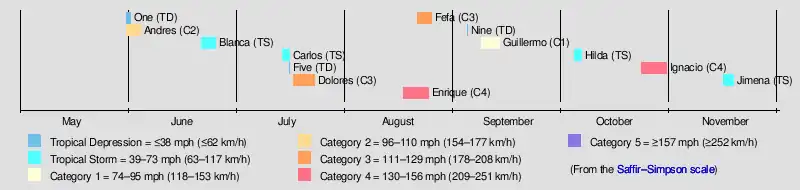 Andres | May 31–June 4 | Category 2 hurricane | 100 (155) | ≤992 | Mexico | None | 2 | [4][6] | ||