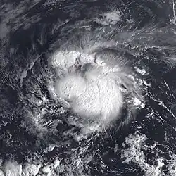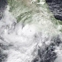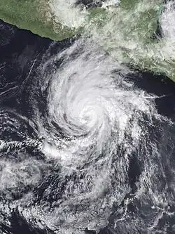 Ignacio turned north and then veered sharply east, entering colder waters. Subsequent reconnaissance of the storm found various changes to its internal structure, including a pinhole eye down to 6 miles (9.7 km) in diameter before it ultimately became ill-defined. Ignacio accelerated toward the Mexico coastline, and around 12:00 UTC on October 30 struck about 160 miles (260 km) east-southeast of Manzanillo, Colima, with much-weakened winds of 35 mph (56 km/h).[4] It transitioned into an extratropical cyclone six hours later, then dissipated over the Yucatán Peninsula the next day.[7][4]