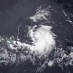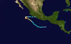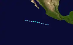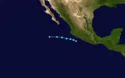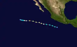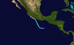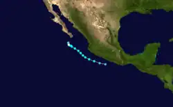 An area of disturbed weather formed south of the Gulf of Tehuantepec on September 7.[4] It organized into a tropical depression around 18:00 UTC on September 8 and intensified into Tropical Storm Guillermo twelve hours later.[7] Flow around the southwest side of upper-level ridging directed the storm to curve northwestward, while the system's track over warm waters allowed it to intensify. It became a hurricane with peak winds of 75 mph (121 km/h) around 18:00 UTC on September 11. Guillermo decelerated over cooler waters south of Baja California,[4] ultimately dissipating after 12:00 UTC on September 13.[7]