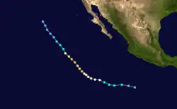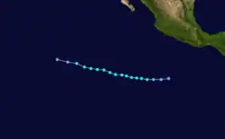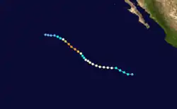 An area of disturbed weather was observed south of Guatemala on July 14.[4] It developed into a tropical depression around 06:00 UTC on July 17 and became Tropical Storm Dolores twelve hours later.[7] Moving along the south side of an upper-level area of high pressure, the cyclone passed over warm waters which facilitated its continued development.[4] It became a hurricane at 18:00 UTC on July 18 and then entered a period of rapid intensification, which coincided with the formation of a well-defined eye on satellite imagery.[4] Dolores strengthened into the season's first major hurricane around 06:00 UTC on July 20 and, after a brief fluctuation in intensity, attained peak winds of 120 mph (190 km/h) early on July 21.[7] High pressure shifted northeast into northern Mexico, causing Dolores to curve northwest into cooler waters and drier air. The system dissipated well to the west of Baja California after 18:00 UTC on July 23.[4]