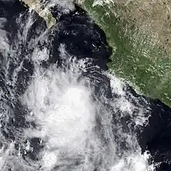 A tropical disturbance formed in the Gulf of Tehuantepec on July 11 and developed into a tropical depression around 18:00 UTC on July 14. The cyclone moved swiftly westward, becoming Tropical Storm Carlos within six hours and reaching peak winds of 50 mph (80 km/h) on July 15. Carlos passed about 20 miles (32 km) south of Socorro Island, soon crossing into cooler waters and drier air. The cyclone dissipated southwest of Baja California Sur after 06:00 UTC on July 16.[4]