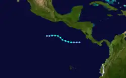 A westward-moving tropical disturbance crossed Costa Rica and Panama into the East Pacific on June 17. The system was slow to organize initially, but developed into a tropical depression by 06:00 UTC on June 21. It further intensified and became Tropical Storm Blanca around 00:00 UTC on June 22. Blanca moved over warm waters and eventually attained peak winds of 50 mph (80 km/h) on June 22–23. The cyclone curved west-northwest and began to weaken, particularly after it encountered colder waters. It dissipated far away from land after 12:00 UTC on June 25.[4]
