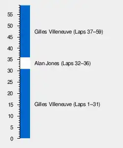 Villeneuve coasted home, allowing Elio de Angelis and Hans-Joachim Stuck to unlap themselves, but finishing with a 48-second margin over Arnoux. Later, Villeneuve revealed that he had been nursing the car with failing oil pressure for the final 25 laps. The American Shadow team celebrated de Angelis' fourth place, his only points of the year. The win by Villeneuve was his third, matching champion Scheckter's total, securing a one-two finish in the Drivers' Championship.