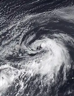 In late September, a cold-core low persisted off the coast of Portugal, moving southwestward. The system gradually developed tropical characteristics as it turned northwestward and executed a loop near the Azores. Eventually, the system organized enough to be designated as a tropical depression on October 4, while just east of the Azores. Shortly thereafter, the depression intensified into Tropical Storm Ivan.[47] However, the National Hurricane Center did not initiate advisories on Ivan until late on October 5.[48] Ivan moved largely in tandem with the upper-level low above it, while its southwest movement was caused by a building ridge to its north.[47] Late on October 5, an eye developed,[49] and Ivan was upgraded to a hurricane on the following day.[47]
