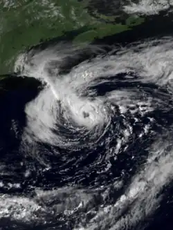 On September 5, satellite imagery suggested a surface circulation had developed, possibly due to interaction with a cold low. As a result, the system regenerated into a subtropical depression at 12:00 UTC on that day, while centered about 360 mi (580 km) southwest of Bermuda.[27][29] Ten hours later, the National Hurricane Center resumed advisories on the subtropical depression.[31] While the subtropical depression was curved northeastward, it strengthened and acquired tropical characteristics. At 00:00 UTC on September 7, the subtropical depression became Tropical Storm Georges.[32] The storm continued to intensify while tracking northeastward and was upgraded to a hurricane about 24 hours after becoming a tropical storm. Simultaneously, Georges attained its peak intensity with winds of 80 mph (130 km/h) and a minimum pressure of 993 mbar (29.3 inHg). However, later on September 8, Georges transitioned into an extratropical cyclone near Cape Race, Newfoundland.[32] While bypassing Newfoundland, Georges dropped light rainfall, with amounts under 1 in (25 mm) of precipitation.[33]