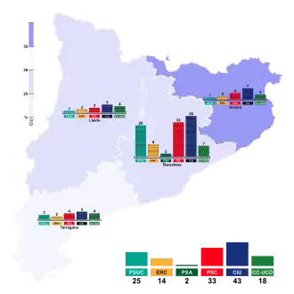 The election results granted a victory with nearly 28% of the vote and 43 seats for the Catalan nationalist Convergence and Union (CiU), the alliance of Democratic Convergence of Catalonia (CDC) and Democratic Union of Catalonia (UDC) led by Jordi Pujol, despite earlier predictions that the Socialists' Party of Catalonia (PSC–PSOE) would emerge as the largest party in parliament and maintain the first place it had achieved in the 1977 and 1979 general elections.[2] Compared to the general elections, the PSC ambiguous positions throughout the campaign were said to have cost them votes both to the Unified Socialist Party of Catalonia (PSUC) and to the Republican Left of Catalonia (ERC)—both of which saw improvements to their general election results—as well as to abstention and, to a lesser extent, to the Socialist Party of Andalusia–Andalusian Party (PSA–PA), which was only narrowly able to enter the Parliament.[3][4] Results for the Centrists of Catalonia (CC–UCD) alliance were seen as disappointing, having lost many votes to Pujol's coalition and being shut from any chance to lead the regional government.[5][6]