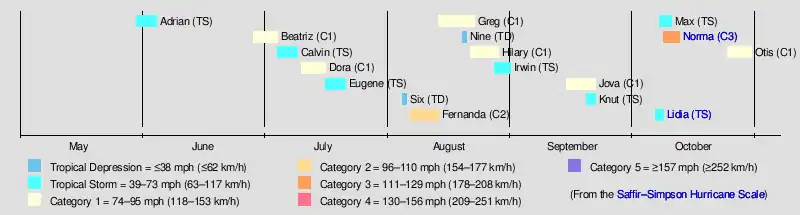 The strongest tropical cyclone of the season was Hurricane Norma, which was a powerful Category 3 hurricane on the Saffir–Simpson Hurricane Scale. The storm caused six deaths – five in Texas, and one in Mexico, due to severe flooding. Additionally, the storm caused $74 million (equivalent to $255.94 million in 2024) in damage, which is credited to significant crop damage and many tornadoes. However, the deadliest tropical cyclone of the season was Tropical Storm Lidia, which made two landfalls – one on the southern tip of the Baja California Peninsula and the other along the shores of Sinaloa in early October. As the result of its heavy rainfall in northwestern Mexico, seventy-three fatalities were reported, along with $80 million in damage.