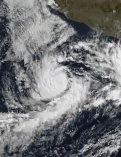 On October 24, the season's last tropical cyclone developed to the south of the Mexican coastline. Moving towards the west-northwest, the depression quickly strengthened into a tropical storm, receiving the name Otis. Turning towards the north and eventually northeast, Otis steadily strengthened, and intensified into a Category 1 hurricane early on October 26. Sharply bending back towards the west-northwest, and eventually the north, Otis reached a peak intensity of 85 mph (135 km/h) before higher wind shear and cooler sea surface temperatures began to impede on the system's organization. On October 29, Otis skirted the coast of Jalisco as a minimal Category 1 hurricane before weakening to a tropical storm. The next day, Otis made landfall near Mazatlán before being absorbed by a frontal system.[4]