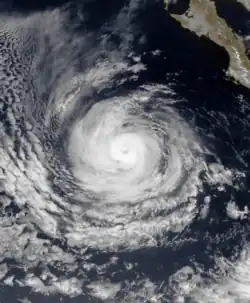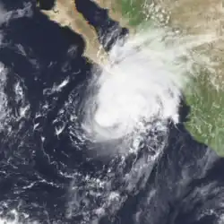A tropical depression formed on October 6[8] ahead of a front;[11] the depression intensified into Tropical Storm Lidia on October 7. Lidia moved generally north, and reached its peak wind speed of 50 mph (85 km/h).[8] Despite encountering warm ocean temperatures, Lidia slowly weakened as it moved towards southern Baja California Peninsula. The tropical cyclone passed over the southern tip of the Baja California Peninsula on 1700 UTC October 7; at the time of the landfall Lidia was located about 65 mi (105 km) northwest of Cabo San Lucas. Two hours later,[4] Lidia entered the Gulf of California, and turned to the northeast.[8] Lidia made landfall on the shores of Sinaloa just south of Los Mochis on October 8, with winds of 45 mph (75 km/h).[4] The remnants of Lidia continued their northeast track, ultimately emerging into the Southern United States,[11] bringing moisture to extreme southeastern Arizona.[12]