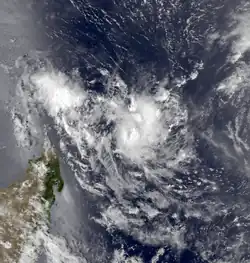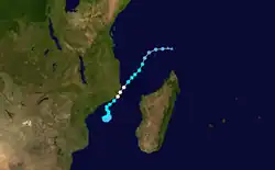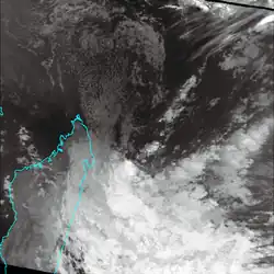 The South Indian convergence zone spawned a circulation that organized into a tropical depression in the Mozambique Channel on January 9. It gradually intensified while moving to the southwest, developing spiral rainbands. On January 11, Elinah passed between Anjouan and Mohéli in the Comoros archipelago. The next day, JTWC upgraded the storm to the equivalent of a minimal hurricane, although land interaction with Mozambique weakened Elinah. After it turned to the south and moved away from the coast, the storm re-intensified, and MFR estimated Elinah reached peak winds of 115 km/h (70 mph) on January 14. Subsequently, the convergence zone caused the storm to weaken, ultimately absorbing it by January 16.[1][13]