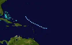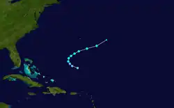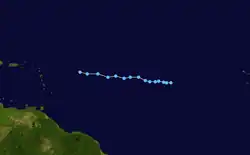 This tropical depression formed 900 miles (1,400 km) west of the Cape Verde Islands on September 16,[38] and moved west-northwest across the tropical Atlantic Ocean.[39] The system moved within 750 miles (1,210 km) east of the Leeward Islands before dissipating on September 20.[40]