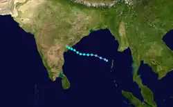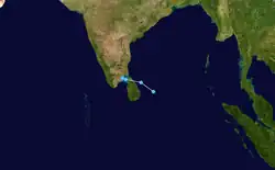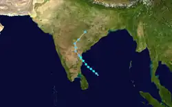 An area of convection south of the previous storm slowly organized into a tropical storm on October 16. It tracked northwestward, reaching a peak of 60 mph winds before hitting southeastern India on the 20th as a weakened 50 mph storm. 60 fatalities can be attributed to this system and 400 huts were damaged.