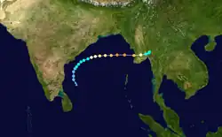 On April 30 the monsoon trough spawned a tropical depression in the western Bay of Bengal. It tracked northeastward, becoming a tropical storm on the 1st and a cyclone on the 2nd. Its movement became more to the east, and the cyclone continued to quickly intensify, reaching a peak of 145 mph winds just before landfall. The small and compact cyclone hit southern Myanmar on the 4th, and it dissipated the next day over land. Moderate to heavy damage was experienced, but advance warning kept the death toll at only five.