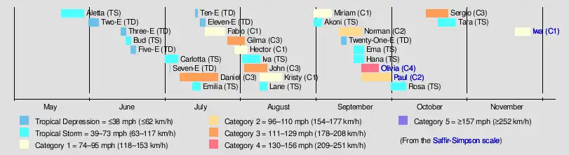 Norman | September 9-18 | Category 2 hurricane | 105 (165) | Unknown | Baja California, Southwestern United States | None | None | |||