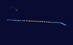 Tropical Depression Thirteen-E formed near 9.5°N 117°30'W and moved slightly north of west. Tropical storm status was attained near noon on July 26, and the cyclone crossed the threshold of hurricane strength late on the night of July 27. By noon on July 29, Gilma reached it maximum intensity of 125 mph (200 km/h) well to the east-southeast of Hawaii. The cyclone weakened and sped up its motion to the west-northwest, crossing into the Central Pacific Basin as a category one hurricane very early on July 30. Gilma was downgraded to a tropical storm late in the morning of July 30, and a tropical depression early on the morning of August 1 as the circulation passed 50 mi (80 km) south of South Point. The cyclone dissipated late on August 1 as it passed 200 mi (300 km) south of Kauai.[4]