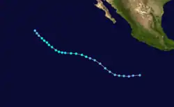 The cyclone developed as a tropical depression southeast of Manzanillo on July 17. Over the next couple of days, it strengthened rapidly into a hurricane as it moved northwest, peaking in intensity with 75 mph (120 km/h) winds. Gradual weakening occurred as Fabio turned westward along the 19th parallel north into cooler waters, eventually dissipating late on July 24.[3]