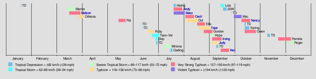 Tropical Storm Mamie moved across the tropical western Pacific Ocean, striking the Philippines and Vietnam during mid to late March. Nelson formed soon after Mamie, becoming the first typhoon of the season which subsequently moved westward through the southern Philippines before dissipating shy of Vietnam in late March. Odessa formed well out to sea, wandering across the western Pacific before dissipating in early April, ending the most active March since 1967. Pat formed in mid May, approaching the Philippines before becoming an extratropical cyclone offshore Japan late in the month. Ruby wandered around the Marianas in late June, becoming an extratropical cyclone east of Japan.