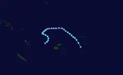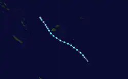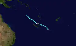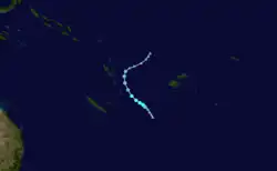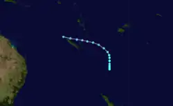 During February 7, Cyclone Harvey moved into the basin from the Australian region as a category 2 tropical cyclone with 10-minute windspeeds of 100 km/h (60 mph).[2][3] During the next day, Harvey gradually weakened as it moved towards the southeast, before at 1800 UTC the JTWC and TCWC Nadi reported that Harvey had weakened below tropical cyclone intensity.[3][4] The subsequent remnant low continued to move towards the south-southeast before it was last noted by the FMS on February 10, while it was located about 270 km (170 mi) to the east of New Caledonia.[2]