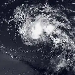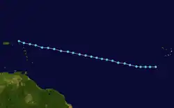 An area of disturbed weather organized into a tropical depression southwest of the Cape Verde Islands on July 27.[8][14] The depression moved generally west-northwestward across the deep Atlantic for several days,[8] but failed to strengthened significantly due to strong upper-level wind shear.[15] The depression dissipated near the northern Leeward Islands on August 2.[8]