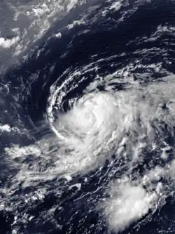 The depression moved to within 100 miles (160 kilometers) of Bermuda and slowly intensified.[19] Late that afternoon, Tropical Depression Five had intensified into a 40 mph (65 km/h) storm and was named Chantal. Chantal intensified rapidly, intensifying to hurricane status late on September 11. It then turned to the east and gained a weak upper-level cirrus-cloud outflow. The structure of the system changed little over the next 24 hours, before Chantal lost organization and was downgraded to a tropical storm on the night of the 12th.[19]