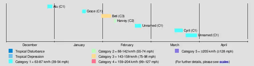 7 systems | December 27 – March 30 | 120 km/h (75 mph) | 970 hPa (28.64 inHg) | Unknown | Unknown |