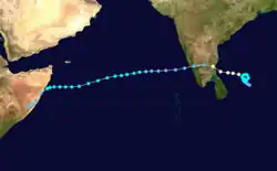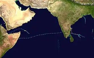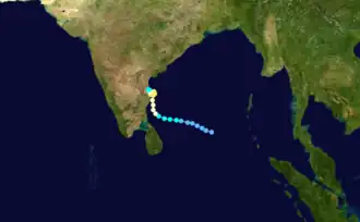 A large area of convection formed in the southwestern area of the Bay of Bengal on November 20. Over the next week, the disturbance moved in a semi-circular path, eventually developing into a tropical depression on November 27. The depression gradually strengthened into a tropical storm on November 28, 04B then began a two day clockwise loop in the central Bay of Bengal, strengthening into a category 1 cyclone on November 30, eventually peaking as a 85 mph cyclone as it made landfall 40 nm (70km) north of Nagapattinam on December 1. 04B then rapidly weakened overland before restrengthening back into a tropical depression over the eastern Arabian Sea on December 2. 04B reattained tropical storm status late on December 3, as it gradually restrengthened into a 70 mph tropical storm on December 5. 04B kept this intensity for a day as shear increased as it approached southern Somalia, making landfall as a dissipating tropical storm on December 7. The system fully dissipated as it reemerged into the Arabian Sea on December 8.[3]